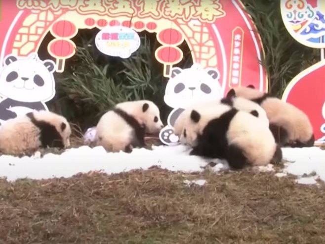 U Nacionalnom prirodnom rezervatu Volong na jugozapadu Kine juče je javnosti predstavljeno 20 mladunčadi panda. Mladunčad panda, stara od četiri do šest meseci, puštena su da se igraju na snegu na početku ceremonije, kojom je obeležen dolazak "Godine tigra" i najavljene predstojeće Olimpijske igre u Pekingu. Kineski Centar za očuvanje i istraživanje džinovskih panda u pokrajini Sečuan, objavio je da je prošle godine isporučeno 27 panda. Prošle godine odabrano je 10 ženki panda za realizaciju plana uzgoja, kako bi sačuvali dobru genetsku raznolikost, uz primenu umetnog uzgoja, sa namerom da nauče majke kako da se brinu o mladuncima. Trenutno u centru živi 356 panda.