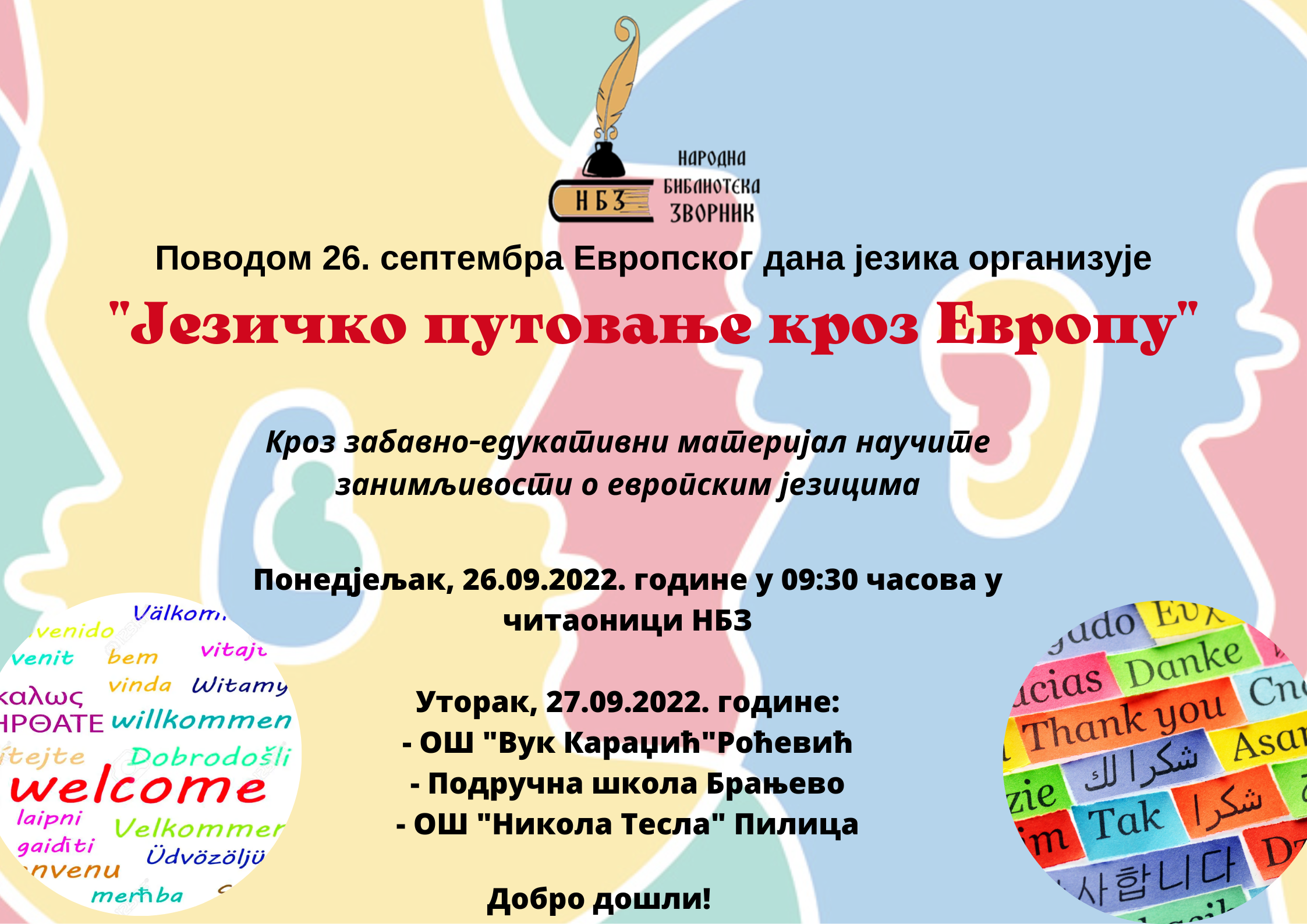 U ponedjeljak, 26.09.2022. godine u 9,30 časova „Jezičko putovanje kroz Evropu“ biće organizovano u čitaonici Narodne biblioteke Zvornik. U utorak je planirana posjeta OŠ „Vuk Karadžić“ iz Roćevića, Područna škola Branjevo, te OŠ „Nikola Tesla“ u Pilici – saopšteno je iz ove ustanove.