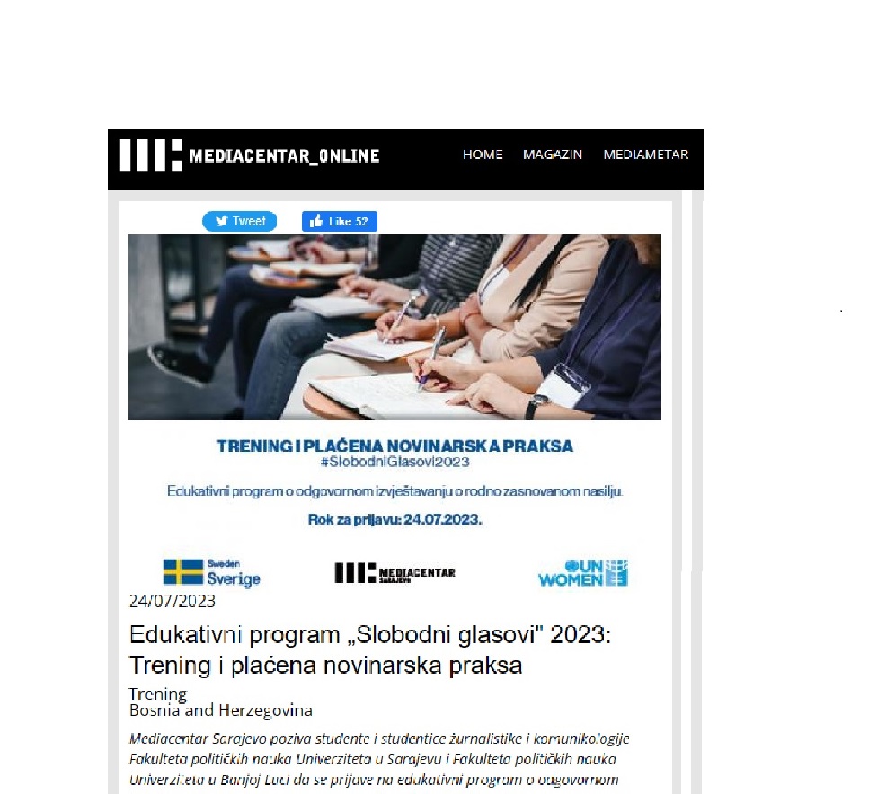 Mediacentar Sarajevo poziva studente i studentice žurnalistike i komunikologije Fakulteta političkih nauka Univerziteta u Sarajevu i Fakulteta političkih nauka Univerziteta u Banjoj Luci da se prijave na edukativni program o odgovornom izvještavanju o rodno zasnovanom nasilju „Slobodni glasovi“.