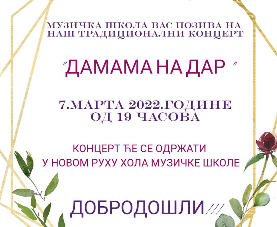 Iz škole, koja je rasadnik mladih talenata koji osvajju prestižne nagrade na svim takmičenjima , pozivaju vas da večeras u 19 časova dođete i uživate u koncertu pod nazivom “ Damama na dar”. Koncert će biti održan u prostoru hola koji spaja ovu školu sa školom “ Sveti Sava”, a koji je nedavno upotpunosti renoviran.