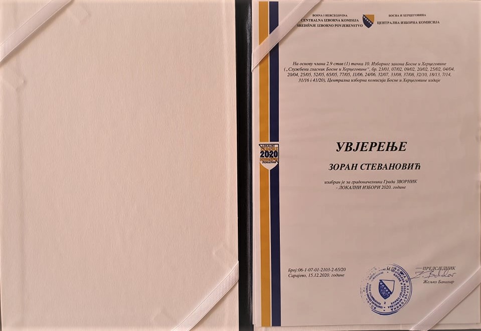 grada Zvornika. On je u Centralnoj izbornoj komisiji u Sarajevu preuzeo