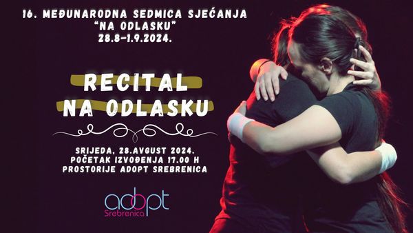 Manifestaciju će otvoriti akademski glumci Mirza Mujagić i Nikolina Gagić izvođenjem istoimenog recitala u bašti Udruženja Adopt Srebrenica sa početkom u 17.00 časova.