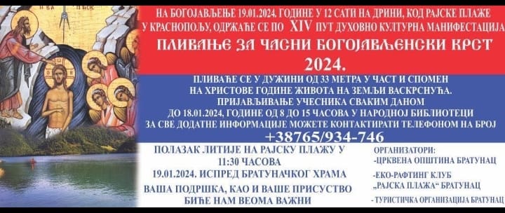 Četrnaesta duhovno- kulturna manifestacija biće održana u 12 časova na rijeci Drini kod Rajske plaže u Krasnopolju.Polazak litije na Rajsku plažu je u 11:30 časova a učesnici će plivati za Časni Bogojavljenski krst u dužini od 33 metra.Prijave učesnika su svakog radnog dana do 18.janara od 8 do 15 časova u Narodnoj biblioteci u Bratuncu.