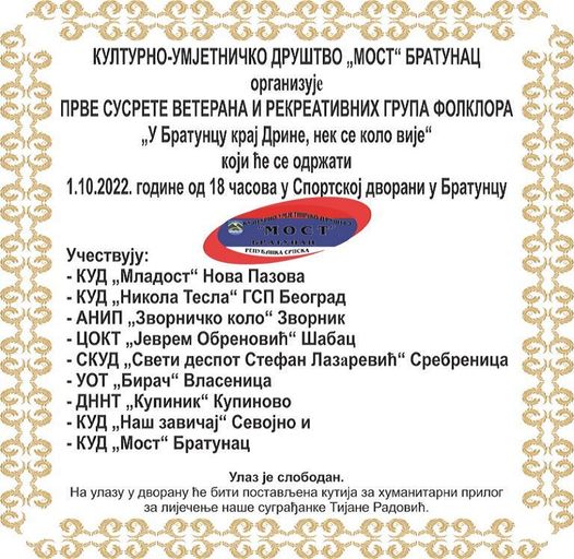 Kulturno umjetničko društvo“Most“ iz Bratunca organizuje prve susrete veterana i rekreativnih grupa folklora pod sloganom “U Bratuncu kraj Drine,nek se kolo vije“.